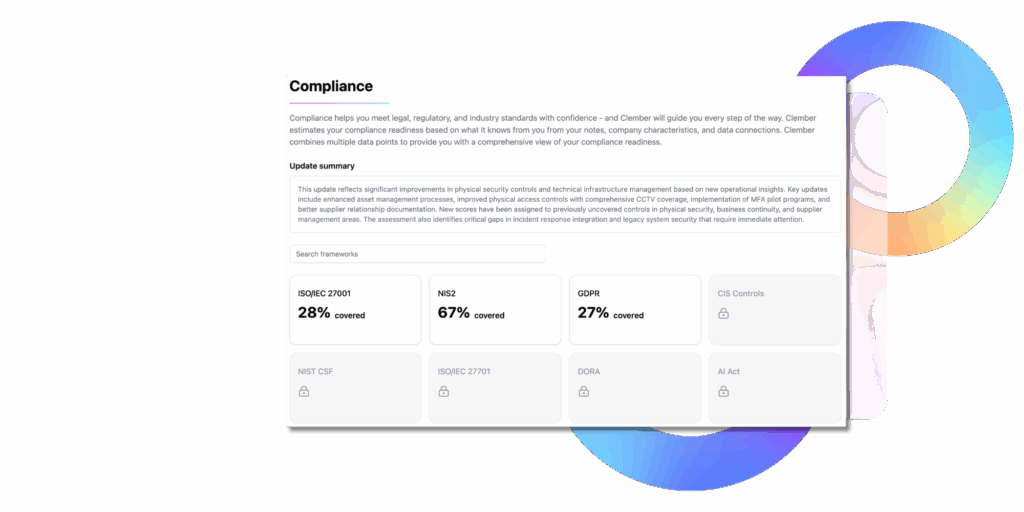 Manually proving compliance is time-consuming and error-prone. Clember automatically maps your controls, gaps, and risks to frameworks like ISO 27001, NIS2, GDPR, and more.